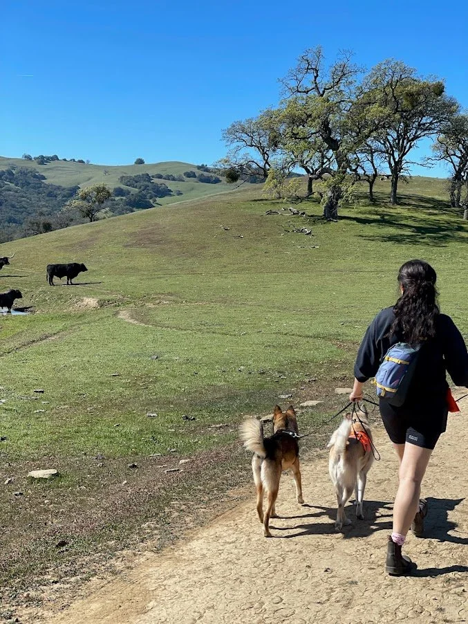 Mana and Oona (foster) calmly checking out some cows on a hike.